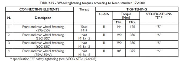 Iveco Daily 29L to 35S 14 - 17 Wheel Lug Nut Torque Setting Information