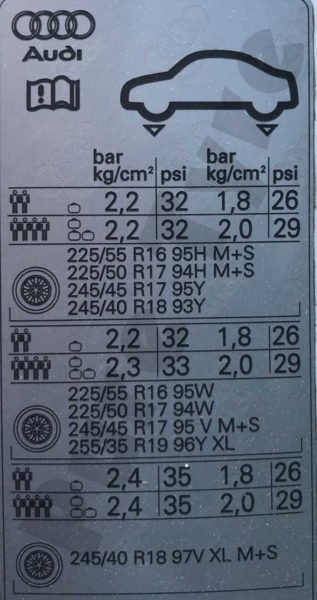 Not all Audi's have a placard attached to the vehicle, if this is the case then you would need to find the vehicles hand book for the correct air pressure listing.