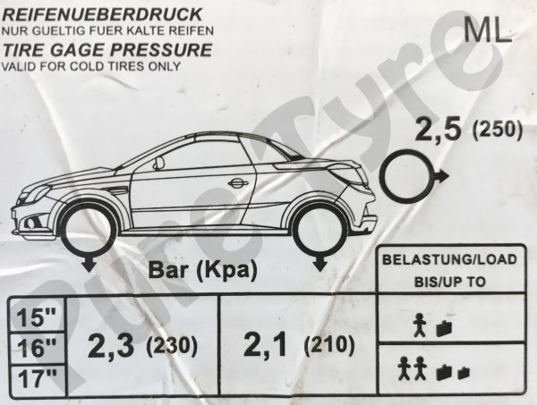 This tyre pressure placard sticker was taken from a Vauxhall Tigra and the tyre pressure placard lists standard air pressures, laden tyre pressures and in some cases even have an "Eco" (Economical driving) setting.